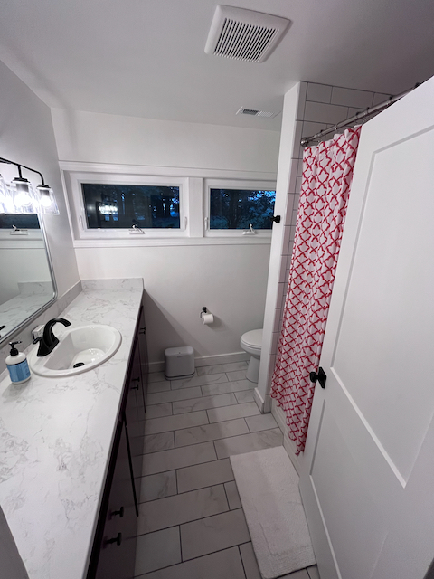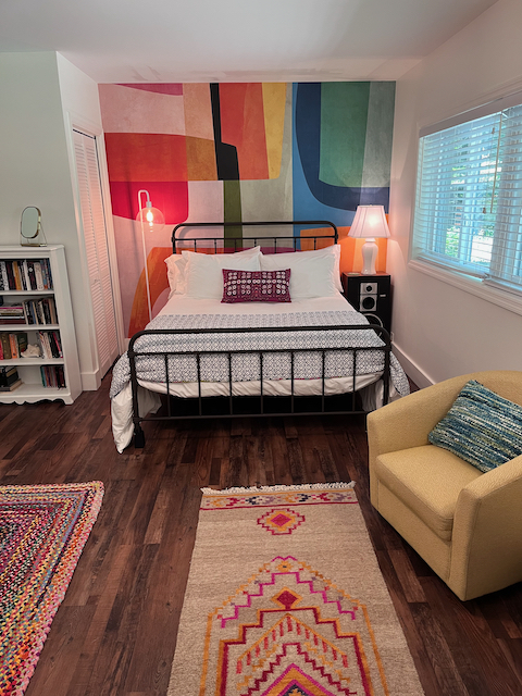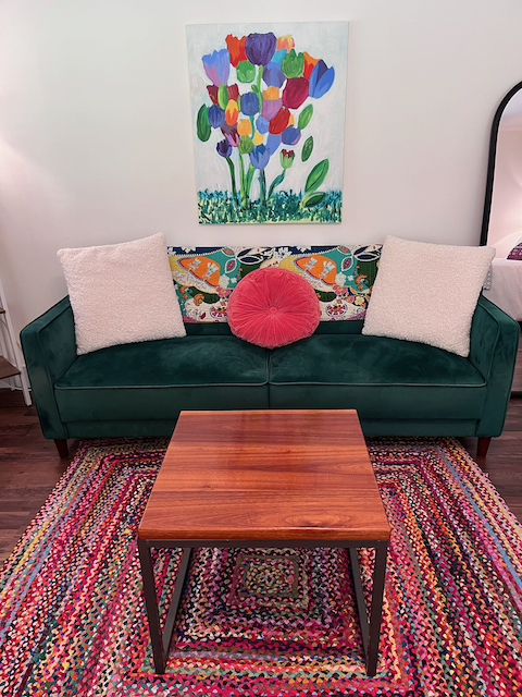 Inside, you’ll find a queen bed and a cozy living area with a pullout sofa, perfect for families or friends traveling together. We also offer the possibility of adding a second bedroom to the rental for select weekends. The kitchenette includes an apartment-size refrigerator and Keurig coffee maker. Green’s View Grotto combines seclusion and convenience, with a private back door leading to a patio with golf course views, off-street parking, and quick access to nearby trailheads, overlooks, and all your favorite campus destinations.